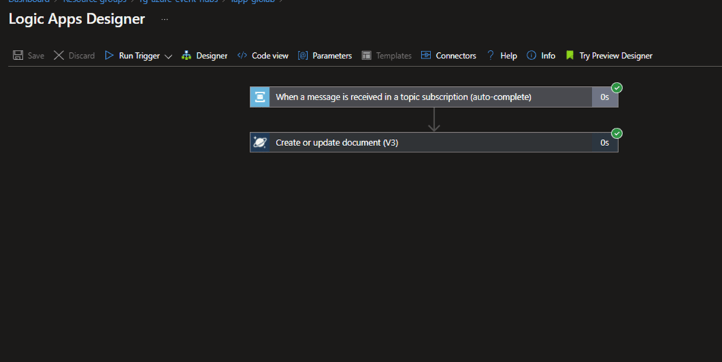Side note: Azure Cosmos DB trigger is not available on the consumption tier. You won’t be able to fire an event coming from Cosmos DB. This connector is currently in preview for the standard tier.